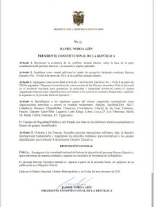 El decreto dispone identificar a los siguientes grupos organizados como «organizaciones terroristas y actores estatales no beligerantes»: