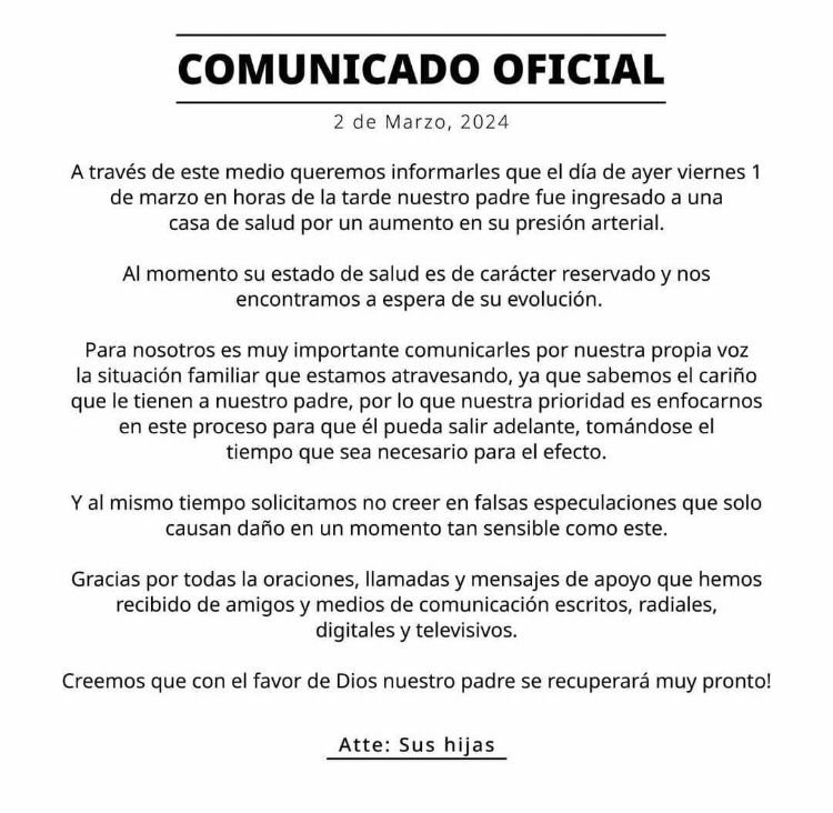 Como familiares afirman entender la preocupación que fanes, seguidores y amigos del artista puedan tener. “Para nosotros es muy importante comunicarles por nuestra propia voz la situación familiar que estamos atravesando, ya que sabemos el cariño que le tienen a nuestro padre, por lo que nuestra prioridad es enfocarnos en este proceso para que él pueda salir adelante, tomándose el tiempo que sea necesario para el efecto”, añaden.