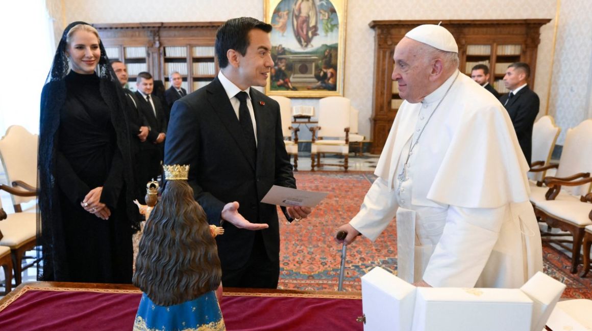 El papa recibió a Noboa y a su esposa, Lavinia Valbonesi, que le dijo: «Padre, un honor conocerle, muchas gracias por recibirnos». Después, ya a solas con el mandatario, Francisco le explicó que Ecuador le traía recuerdos: «como cuando fui rector de la facultad jesuita fui a trabajar allí», precisó.