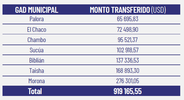 a Baños y USD 143 mil a Penipe. Es decir, en esta semana, se ha entregado cerca de USD 1,3 millones a los
