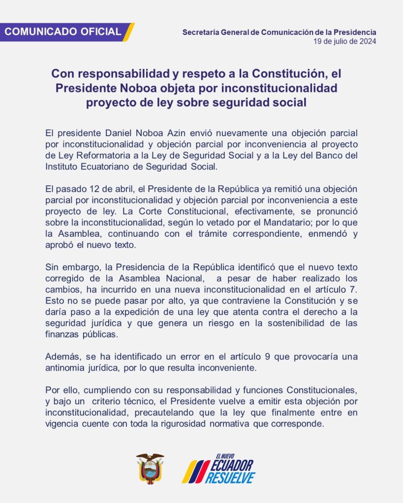 Presidente Noboa objeta por inconstitucionalidad proyecto de ley sobre seguridad social