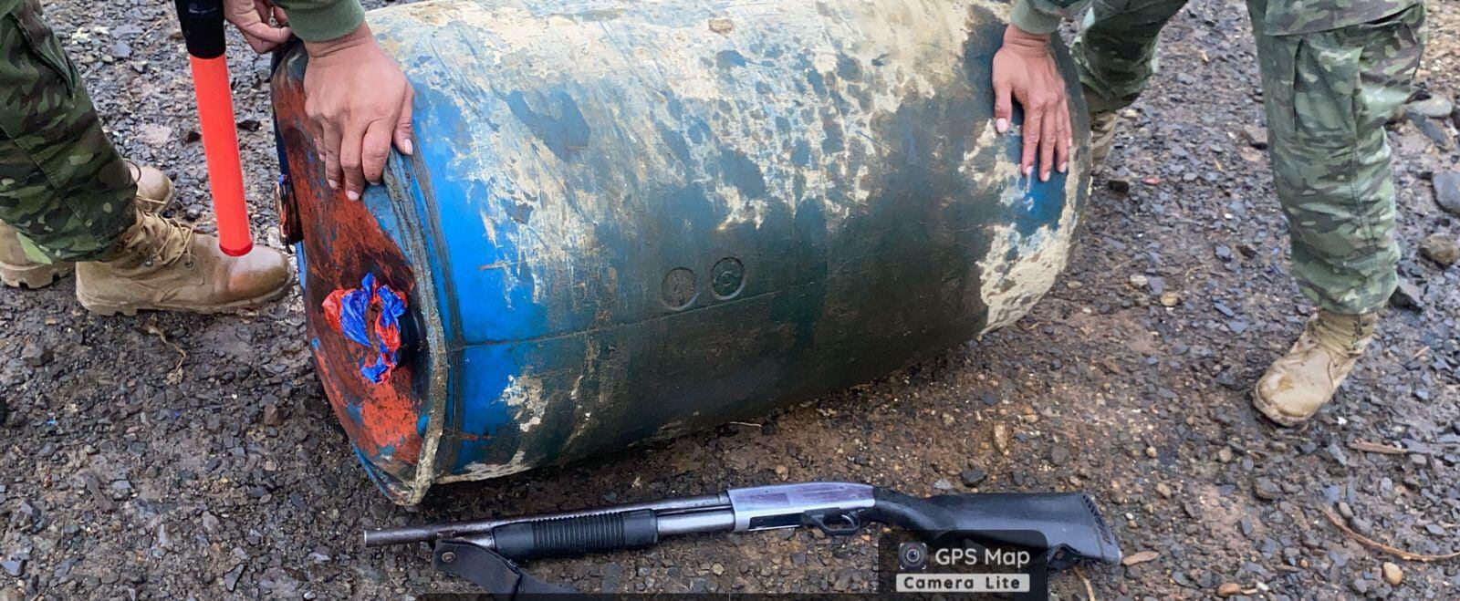 Además se hallaron como indicios 20 metros de manguera de alta presión de 1 pulgada; 10 metros de manguera de alta presión de 1/2 pulgada; 2 válvulas de presión de 1 y 1/2 pulgada; y una perforación clandestina, informó Fuerzas Armadas.