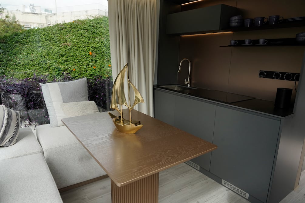 A la estructura, que es importada desde China, se le colocan electrodomésticos como refrigerador, congelador, cocina de inducción, así como instalaciones eléctricas y sanitarias por pedido del cliente. Los ventanales permiten tener una visualización de 360 grados.