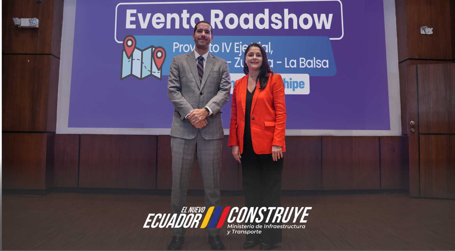El ministro de Infraestructura y Transporte, Roberto Luque, y la representante del Banco Interamericano de Desarrollo (BID) en Ecuador, Ignez Tristao, socializaron el proyecto del IV Eje Vial, tramo Bellavista – Zumba – La Balsa de 54 km, en Zamora Chinchipe, mediante un Roadshow (ronda de presentaciones) dirigido a consultores y constructores nacionales e internacionales interesados en participar en la licitación del diseño, construcción, mantenimiento, así como la supervisión de esta importante obra que conecta Ecuador con Perú.