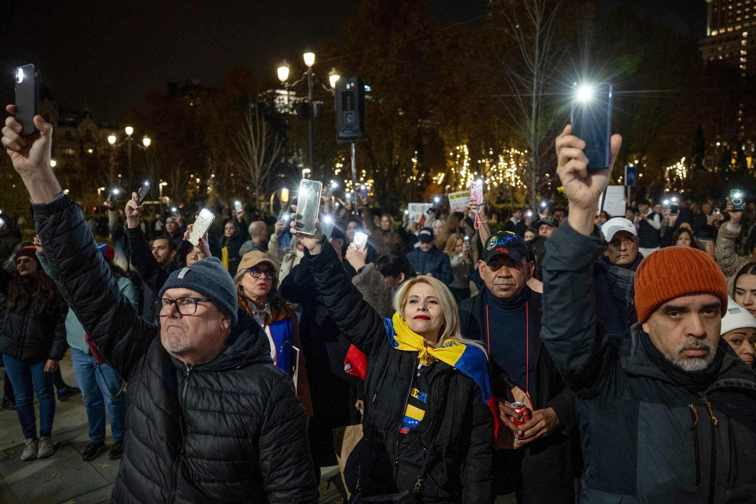 La manifestación ha continuado con una marcha de antorchas que ha recorrido el centro de Madrid, desplegando una bandera venezolana de grandes dimensiones. La comitiva ha estado acompañada por disfraces del presidente estadounidense Donald Trump, un plátano con la cara de Nicolás Maduro y animales ataviados con la bandera de Venezuela, en un ambiente festivo y reivindicativo.