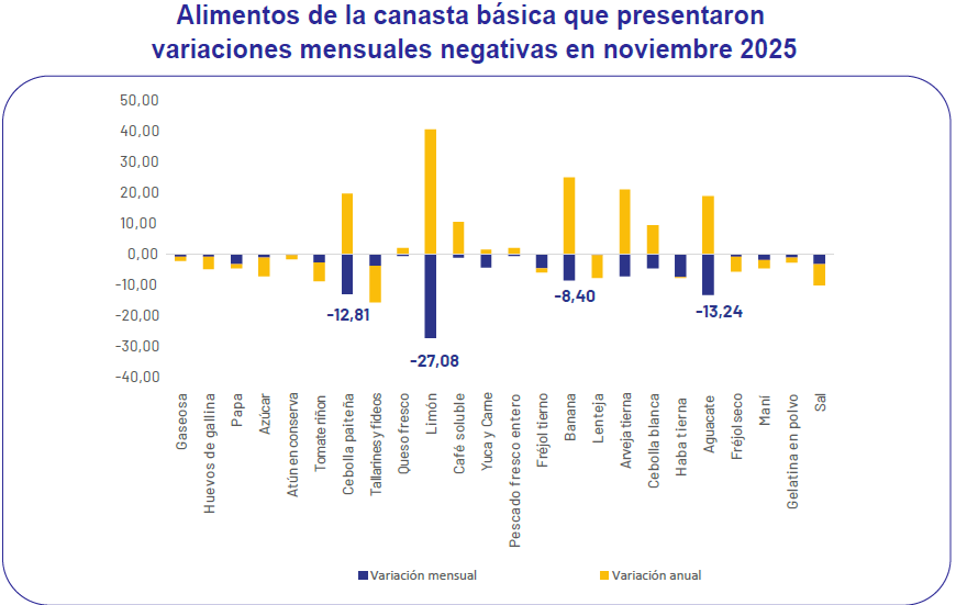 En noviembre de 2025, el 64,9% de los alimentos que conforman la canasta básica presentaron variaciones negativas mensuales, entre los que se destacan los huevos, la papa y el azúcar, productos de consumo cotidiano en los hogares ecuatorianos.