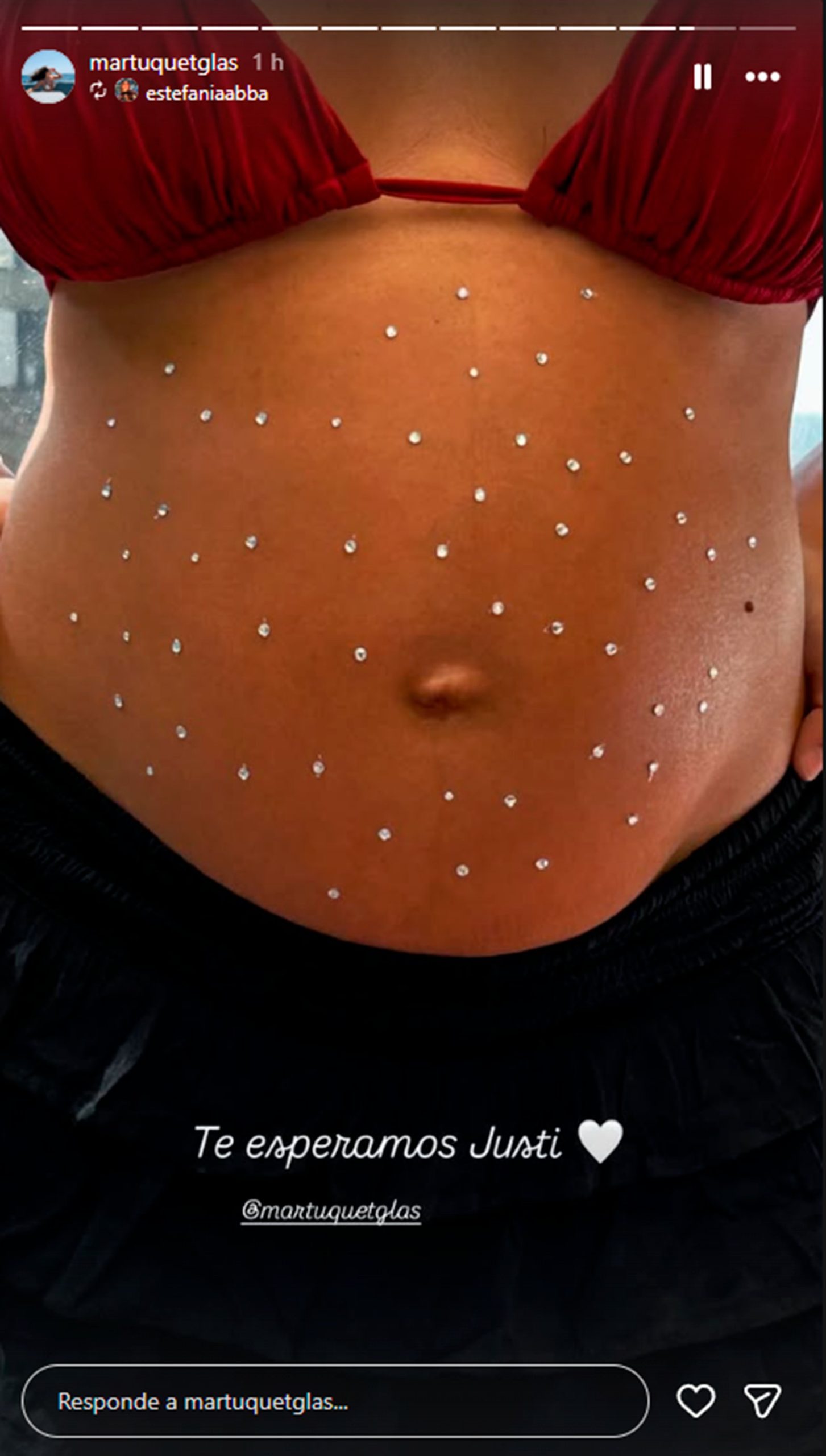 Las imágenes, que fueron publicadas principalmente en las historias de Instagram de ambos, revelaron una decoración sumamente delicada y detallista. Martina Quetglas acaparó todas las miradas al lucir su avanzado embarazo con un toque artístico, interviniendo su vientre con sutiles brillos plateados. Vistiendo una bikini de tono bordó complementada con una falda negra, la futura madre posó con gran felicidad, acompañando una de las capturas con la conmovedora frase: