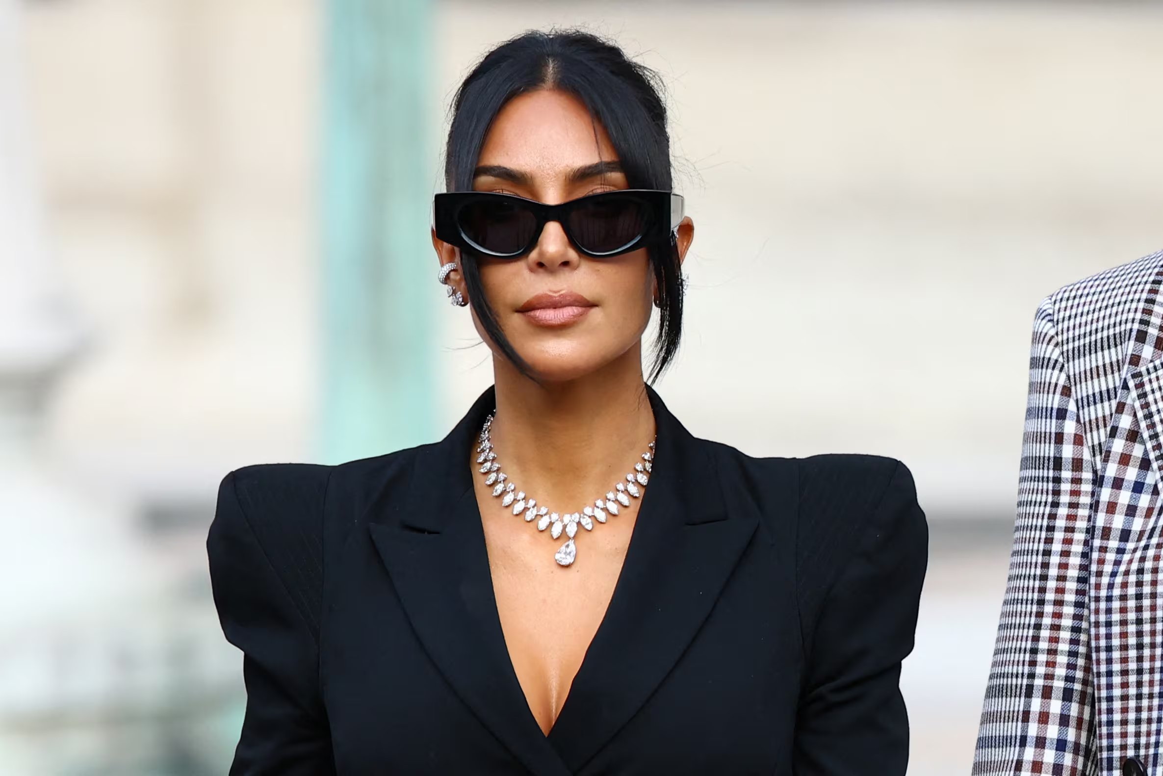 En un giro hacia lo urbano pero sofisticado, Kardashian lució leggings negros opacos combinados con una campera de cuero de estilo oversize. Esta pieza destacaba por su acabado brillante y un cinturón que marcaba su silueta en la cintura. En esta ocasión, optó por la comodidad de unos zapatos tipo ballet planos y un cabello liso, manteniendo un maquillaje sumamente sobrio para resaltar la prenda superior.
