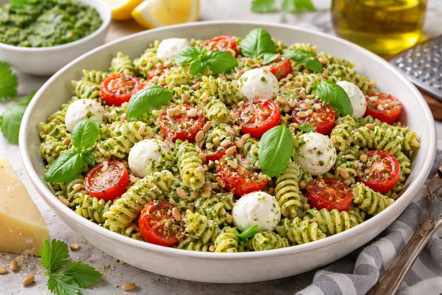 Este plato tiene raíces mediterráneas y se ha convertido en un imprescindible del verano. El contraste del pesto con la textura firme de la pasta y el toque fresco de los ingredientes vegetales hacen que combine perfectamente con vinos blancos jóvenes o una cerveza fría.