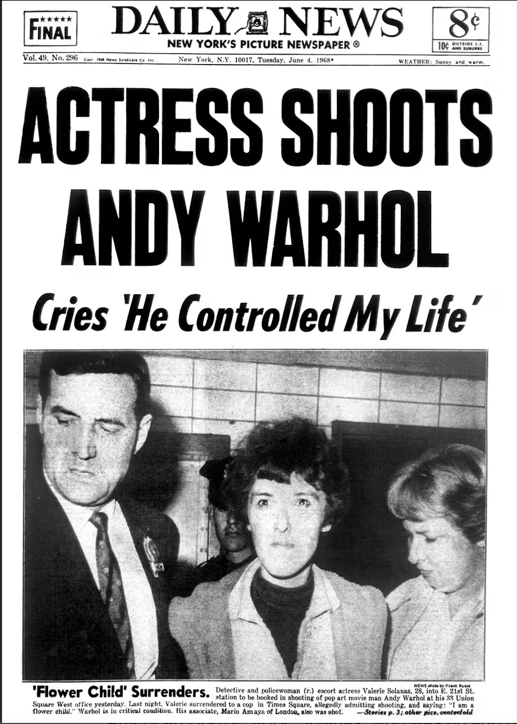 El 3 de junio de 1968, la trayectoria del artista dio un giro trágico cuando Valerie Solanas, una actriz que buscaba notoriedad, atentó contra su vida. El ataque ocurrió a las 16:30 dentro de The Factory. Solanas utilizó un revólver calibre 32 y disparó en tres ocasiones. Aunque falló los dos primeros intentos, el tercer proyectil alcanzó el abdomen de Warhol. A pesar de la gravedad de las heridas y de que su salud quedó debilitada permanentemente, el artista logró sobrevivir y se reintegró con el tiempo a la vibrante vida artística de Nueva York.