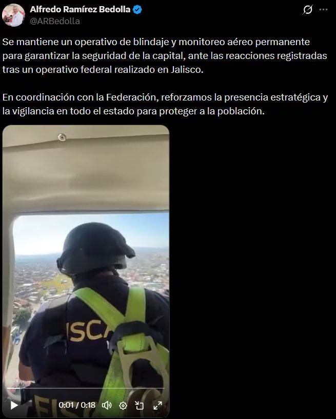 “Les recomendamos no circular por carreteras, los sucesos violentos se han extendido a cuando menos cinco entidades federativas. Continuamos en plena coordinación con la Federación”