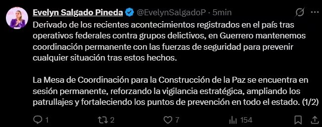 La gobernadora de Guerrero, Evelyn Salgado Pineda, también reaccionó ante la coyuntura nacional. Informó que su administración mantiene una vigilancia estrecha y que la Mesa de Coordinación para la Construcción de la Paz se mantiene en sesión continua. Además, se han intensificado los patrullajes y los controles preventivos en puntos clave de toda la geografía guerrerense.