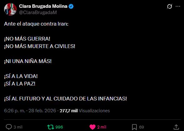 A raíz del estallido de la ofensiva militar coordinada entre Estados Unidos e Israel sobre territorio de Irán, la jefa de Gobierno de la Ciudad de México, Clara Brugada Molina, se pronunció con firmeza para repudiar el conflicto bélico y demandar el cese inmediato de las acciones armadas. Mediante su perfil oficial en la plataforma X, la gobernante capitalina difundió un mensaje categórico que generó un impacto inmediato en la opinión pública internacional.