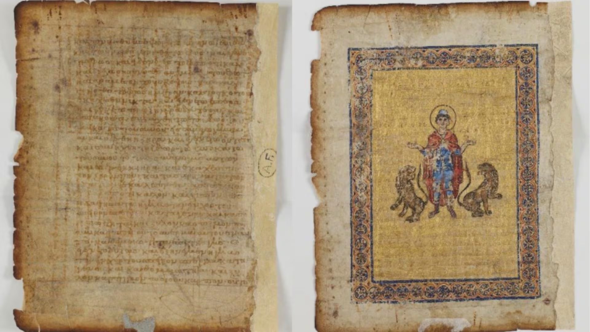 “hoy, lo que vemos es el texto griego y, en el reverso, una iluminación que representa al profeta Daniel rodeado de dos leones”