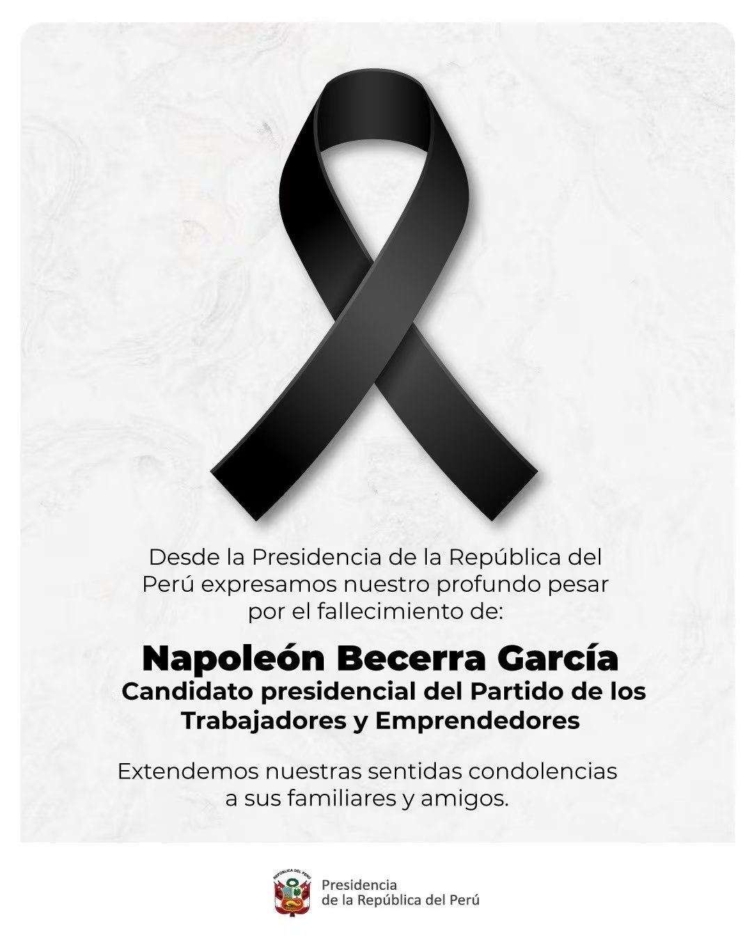 “Expresamos nuestras condolencias por el sensible fallecimiento de Napoleón Becerra García, candidato presidencial del Partido de los Trabajadores y Emprendedores. Hacemos extensivo nuestro pesar a sus familiares, amigos y seguidores en este difícil momento. Que descanse en paz”