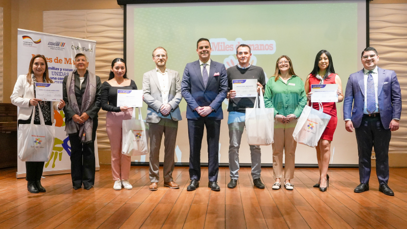 Finalmente, autoridades del MINEDEC, la Embajada de Alemania, GIZ y ChildFund realizaron la entrega simbólica de kits pedagógicos —que incluyen materiales de formación en “Miles de Manos”— y certificados de participación a profesionales DECE de las zonas 2 y 9, en representación de todos los participantes del país.