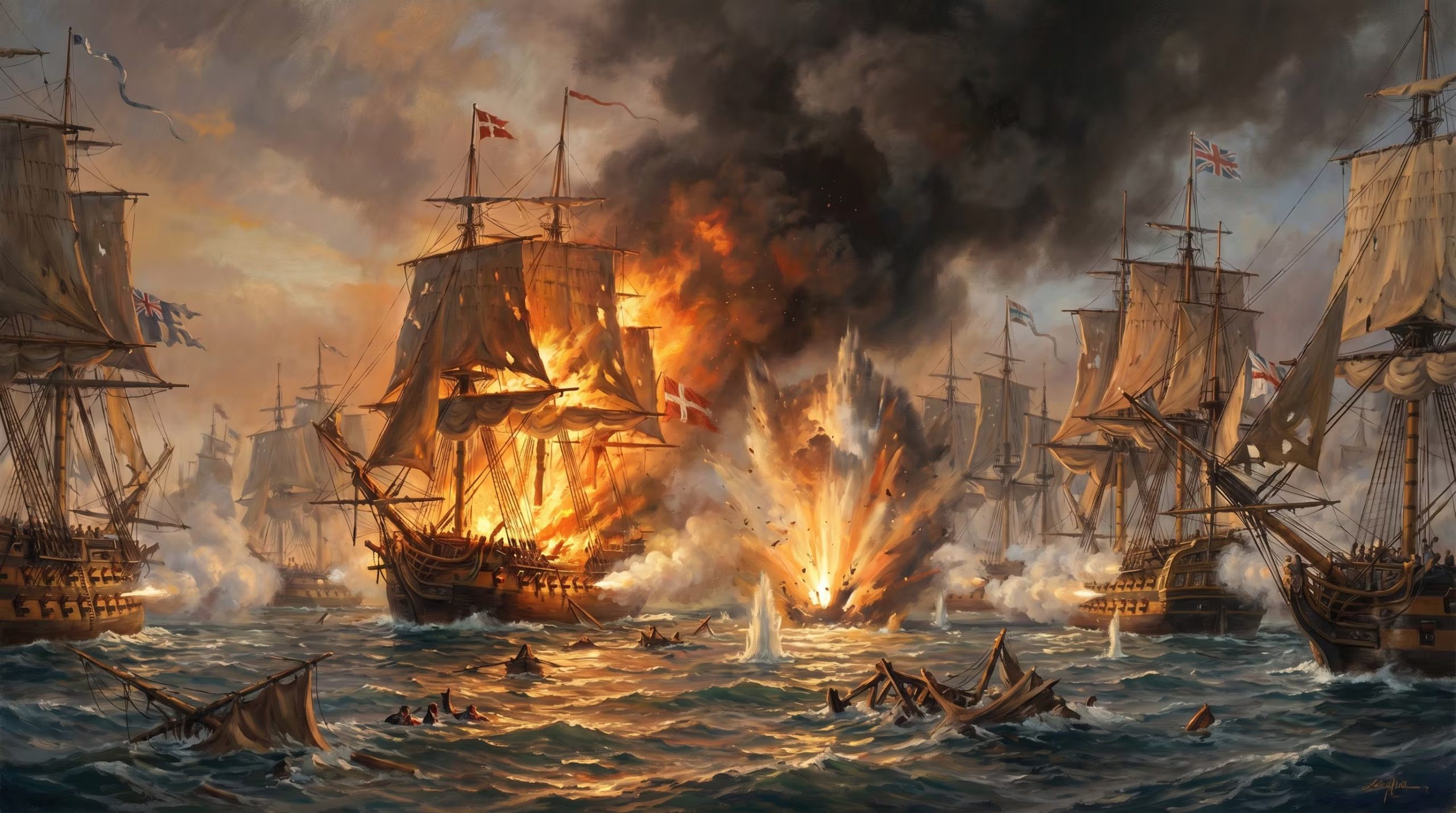El impacto de los proyectiles contra la madera generaba nubes de astillas que actuaban como metralla mortal para los hombres a bordo. Tras perder el control y quedar a la deriva hacia el sector norte del puerto, una detonación masiva destruyó por completo el navío, provocando un estruendo que, según los relatos, sacudió a toda la ciudad de Copenhague antes de que el barco se hundiera.