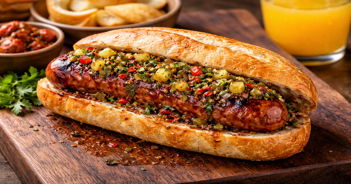 El choripán es el corazón de toda parrillada. Es el primero en salir, el que reúne a todos alrededor del fuego. Esta versión eleva lo clásico con un giro fresco, ideal para abrir el encuentro.
