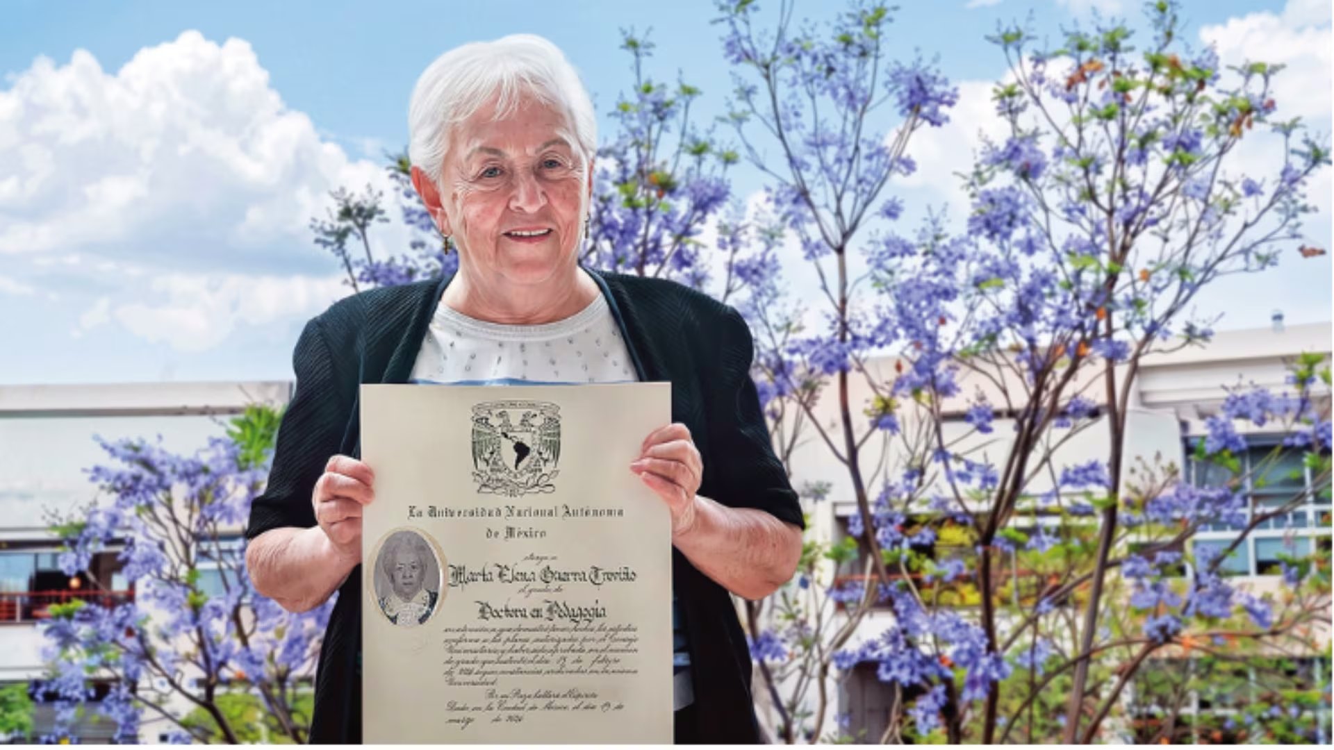 relató con notable emoción al recordar el camino recorrido desde su hogar, espacio que ha sido testigo silencioso de su evolución como profesional, docente, madre y mujer. Hoy en día, Guerra Treviño se ha consagrado como la persona más longeva en acreditar un grado doctoral en la Máxima Casa de Estudios mexicana. Aunque su anhelo por formarse en esta institución nació en su juventud, fue recién a los 42 años cuando inició su licenciatura en Lengua y Literaturas Modernas Inglesas dentro de la Facultad de Filosofía y Letras.