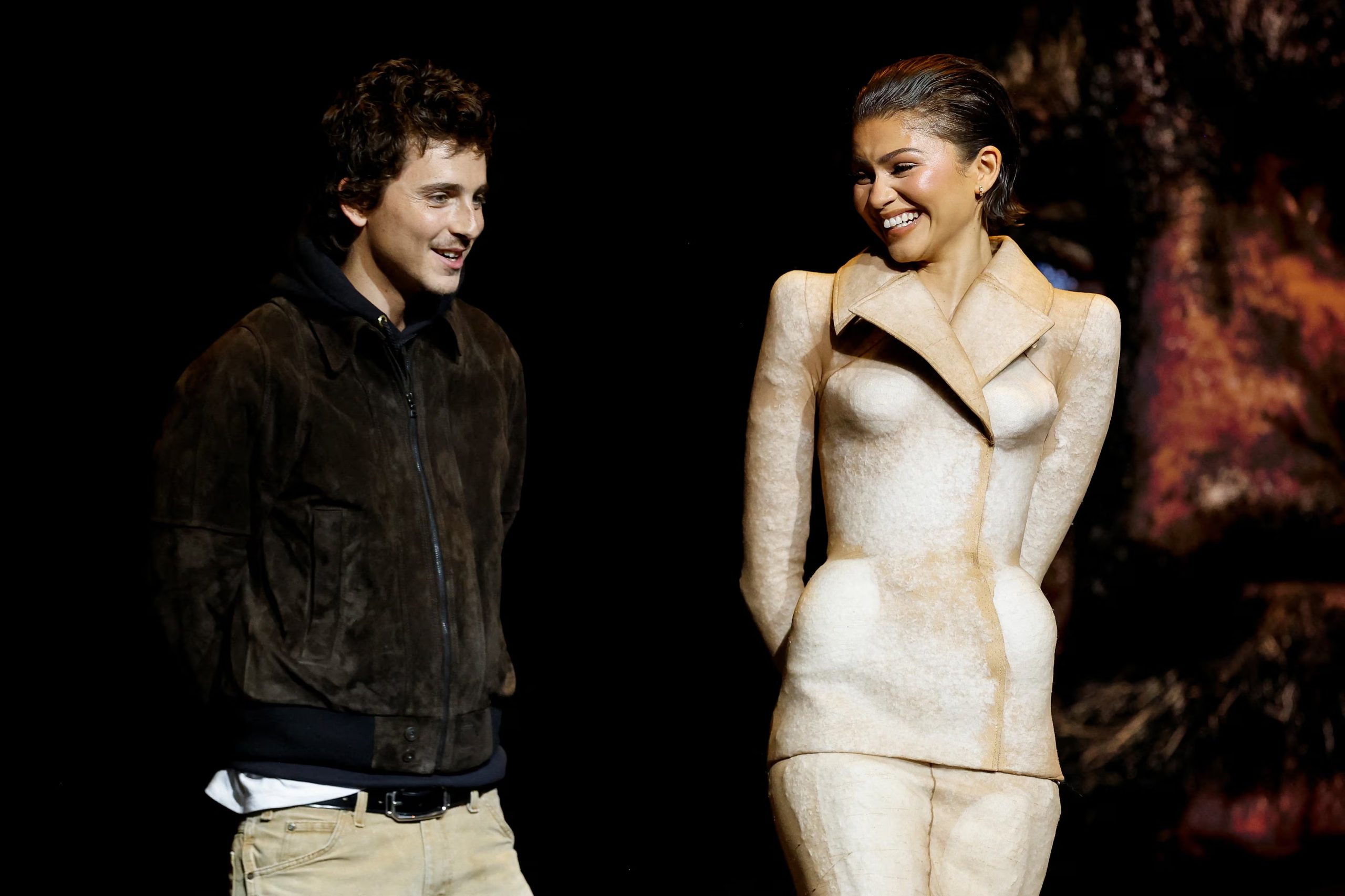 En contraste, Timothée Chalamet optó por una propuesta de inspiración casual. El actor vistió una chaqueta de gamuza en tono marrón oscuro, combinada estratégicamente con una sudadera negra de capucha y una camiseta blanca que sobresalía bajo el borde. Un pantalón de mezclilla en beige, tonalidad similar a la de Zendaya, junto a un cinturón negro discreto, terminaron de sellar la sintonía cromática del dúo.