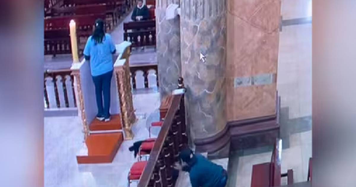 En redes sociales, la iglesia San Juan Bautista difundió un clip audiovisual sobre el robo de una cartera en el atrio del centro religioso mientras una señora rezaba.