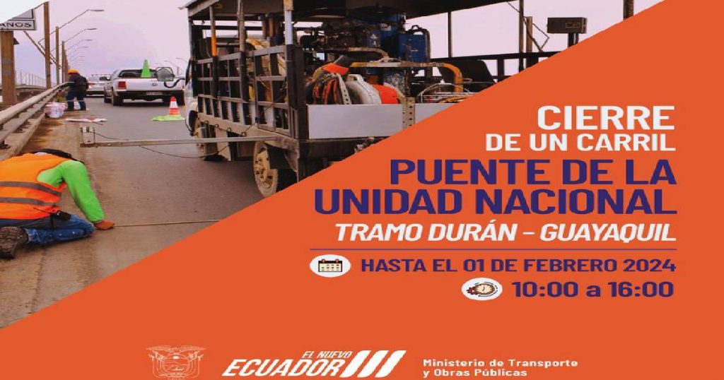 #Guayas | Recuerda que realizamos tareas de demarcación vial en el puente de la Unidad Nacional, tramo Durán – Guayaquil. Trabajamos para mejorar la vialidad del país. 🇪🇨 pic.twitter.com/si0Nrto6V2 — Ministerio de Transporte y Obras Públicas 🇪🇨 (@ObrasPublicasEc) January 27, 2024 Fuente: MTOP ra
